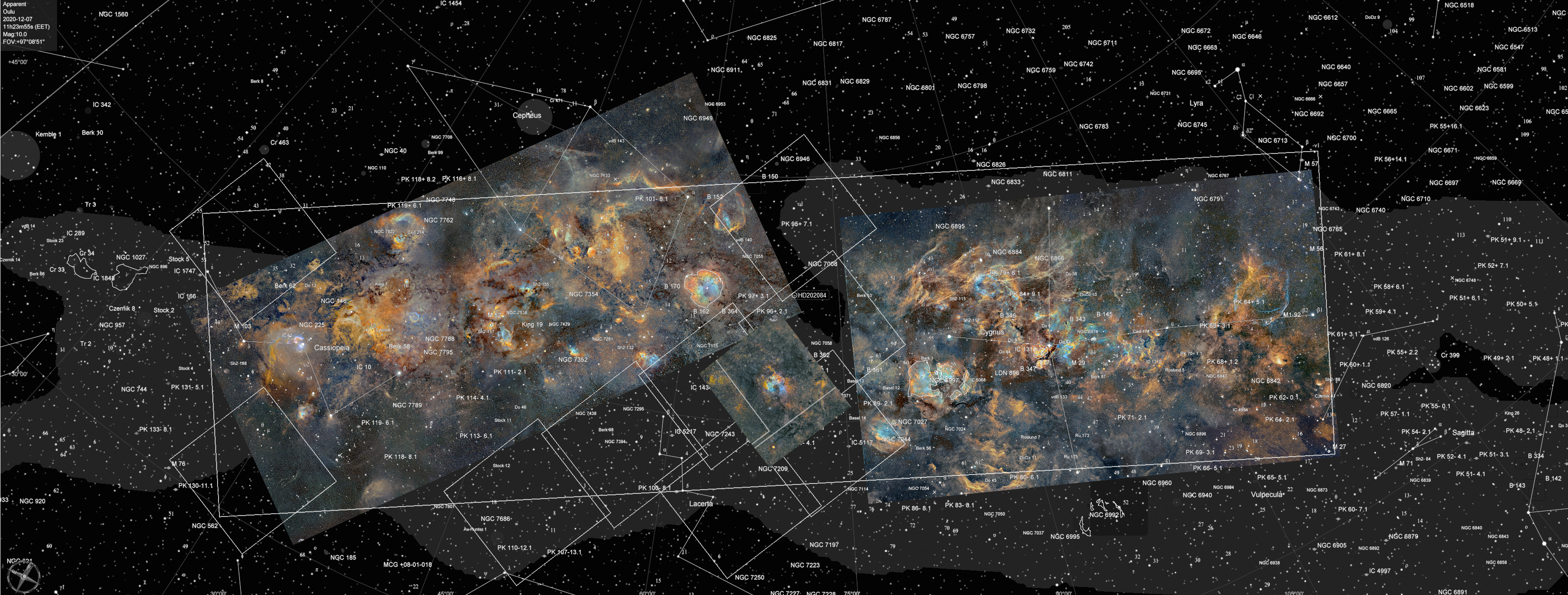 This very large mosaic image shows the entire constellation Cygnus. Sharpless 114 is indicated by a white rectangle.