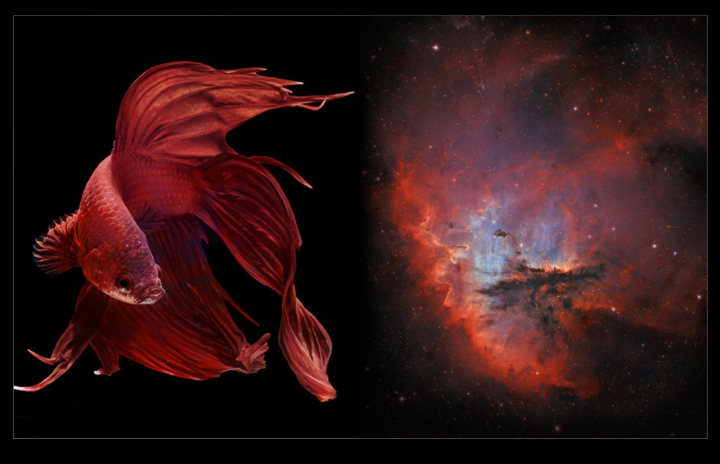 At 31. October I shot the raw frames for the NGC 281. Yesterday I combined them as a final color photo. When the photo was ready, I didn't saw the usual "Pac Man" figure but a Siamese fighting fish!