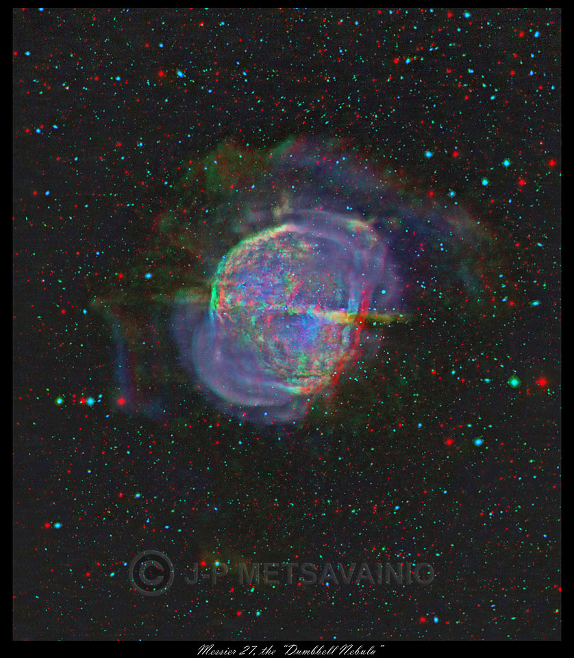 The Dumbbell Nebula (also known as a Messier 27, M 27, or NGC 6853) is a planetary nebula in the constellation Vulpecula, at a distance of about 1360 light years. It has a large angular diameter as a planetary nebula, about 8 x 5,6 arc minutes. (Rarely imaged outer halo is not included, it can be seen in my image. With an outer shell, the diameter is over 15'' (more than a size of  the half a Moon))
