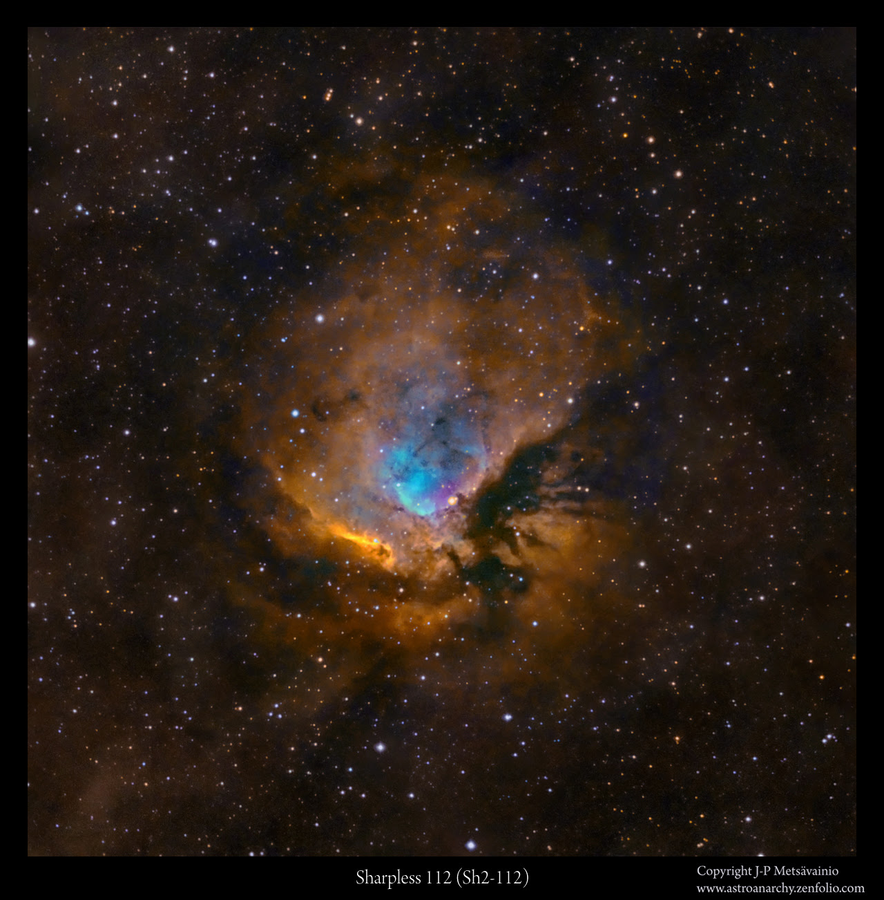 Sharpless object 112 can be seen as a dim batch at left, near a bottom edge, next to a brighter blue area, in a topmost image.